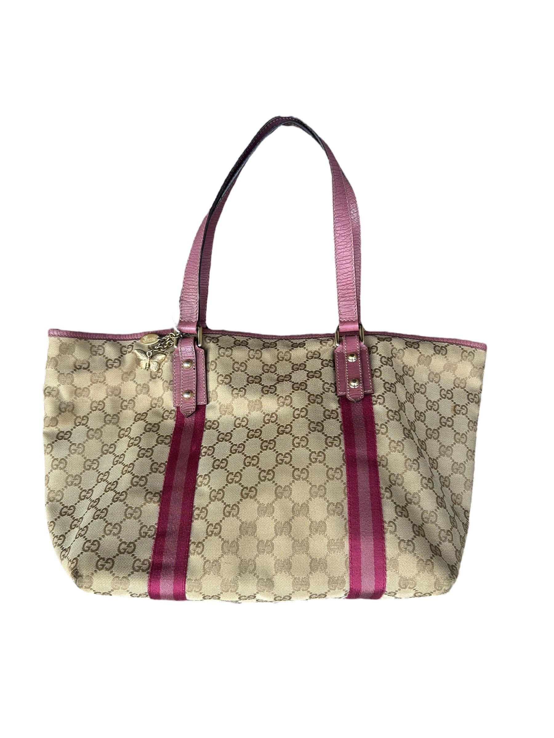 Gucci Canvas Sherry Line Pink Tote Bag. This beautiful Gucci makes the perfect every bag- features pink straps and Gucci bag charms.